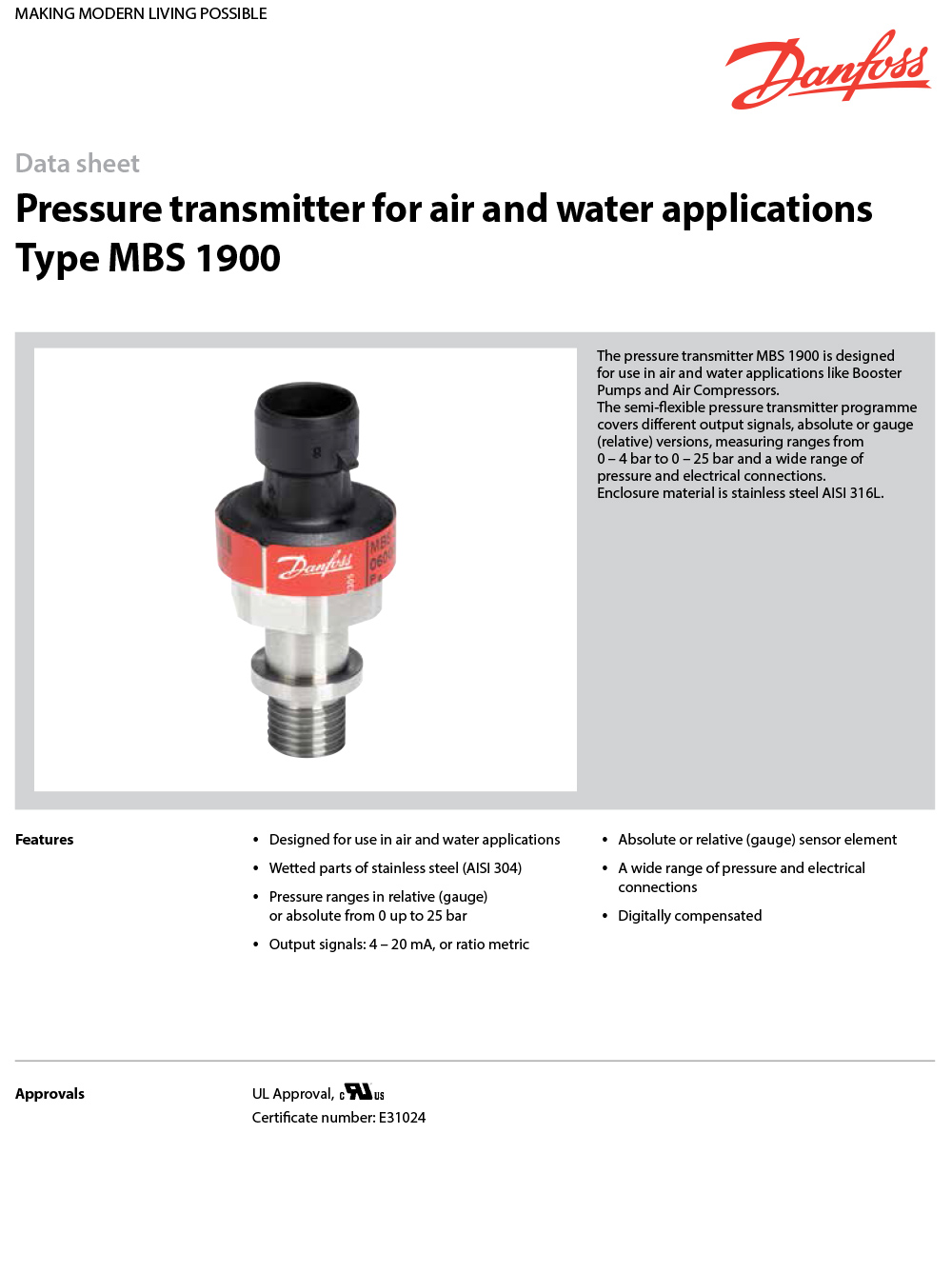 mbs 1900, 空氣與水應(yīng)用的壓力變送器