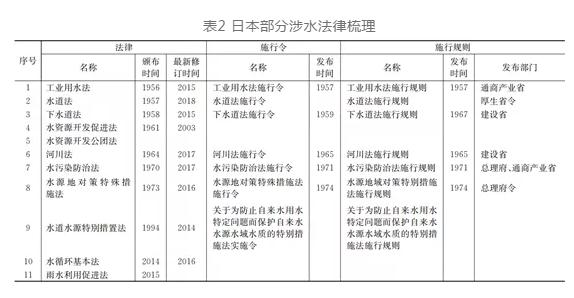 日本的法律體系可以分為憲法、法律、政令、省令和通達(dá)5個層次。通過國會頒布法律、內(nèi)閣頒布政令以及省頒布省令,對涉水工作進(jìn)行全面的規(guī)定(見表2)。例如國會頒布《河川法》,內(nèi)閣負(fù)責(zé)發(fā)布《河川法施行令》,主管河道的國土交通省負(fù)責(zé)發(fā)布《河川法施行規(guī)則》。整個法律體系層次清晰、責(zé)任明確、詳略互補,全方位指導(dǎo)涉水工作的開展。日本城市水系統(tǒng)相關(guān)法律較為豐富,核心的涉水法律有《河川法》《水資源開發(fā)促進(jìn)法》《水道法》《下水道法》《水污染防治法》等10余部,覆蓋了河流水系、水資源、供水、用水、排水、水環(huán)境和健康水循環(huán)理念等水系統(tǒng)多角度、全要素的內(nèi)容。日本涉水法律內(nèi)容詳盡,明確涉水工作的責(zé)任主體、職能分工、協(xié)調(diào)機(jī)制,部分法律還對技術(shù)標(biāo)準(zhǔn)進(jìn)行詳細(xì)規(guī)定,例如《水道法》將水質(zhì)基準(zhǔn)的內(nèi)容納入法律框架體系,強(qiáng)化了標(biāo)準(zhǔn)執(zhí)行力度。日本涉水法律體系修訂更新周期短,如有必要最短1年時間即可開展法律修訂,例如《下水道法》在2005年、2011年和2015年分別針對城市內(nèi)澇、事權(quán)改革、雨水公共下水道建設(shè)問題開展修訂,極大的保障了法律的適應(yīng)性。