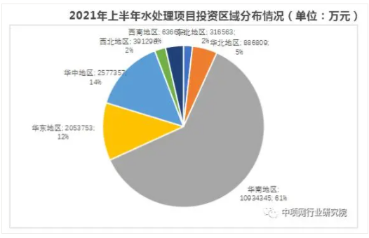 2021年上半年水處理行業(yè)項(xiàng)目投資額為1800億元,同比上年同期下降48.7%。今年上半年水處理項(xiàng)目主要集中在華南地區(qū),行業(yè)項(xiàng)目投資1093億元。