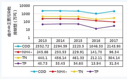 根據(jù)2013-2017年《中國統(tǒng)計年鑒》,我國廢水排放總量保持在700億噸,其中廢水中cod、氨氮(nh4+)、總氮(tn)、tp排放量如下圖,可見2015年國務(wù)院發(fā)布了《水污染防治行動計劃》(簡稱“水十條”)后,這幾種污染物排放量得到了削減。