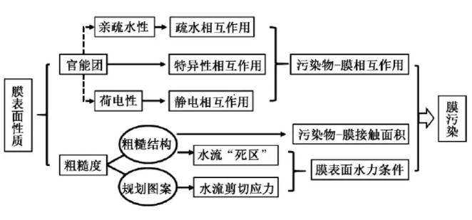 因此,全面總結(jié)膜污染與膜表面性質(zhì)相關(guān)性方面的研究進(jìn)展,對(duì)膜材料研發(fā)和膜污染控制具有重要的指導(dǎo)意義。根據(jù)污染物不同,膜污染類型可分為有機(jī)污染、無機(jī)污染、結(jié)垢污染和生物污染4大類。有機(jī)污染主要由進(jìn)水中的腐殖質(zhì)、多糖和蛋白質(zhì)等溶解性有機(jī)物導(dǎo)致,對(duì)應(yīng)膜污染研究中常用的模型污染物分別為腐殖酸(ha) 或富里酸(fa) 、海藻酸鈉(sa) 和牛血清蛋白(bsa) 。無機(jī)污染是由水體中的鋁、鐵、硅等無機(jī)膠體和微粒造成的污染,而結(jié)垢污染一般指的是鈣等二價(jià)陽離子的碳酸鹽、硫酸鹽和磷酸鹽以及硅酸等物質(zhì)在膜表面的結(jié)晶或沉積。生物污染則由粘附在膜表面的微生物及其代謝產(chǎn)物引起,二者共同形成生物膜后會(huì)進(jìn)一步加重生物污染。在實(shí)際應(yīng)用中,通常出現(xiàn)的是由多種污染物共存造成的復(fù)合污染,并且進(jìn)水水質(zhì)的差異也會(huì)導(dǎo)致膜污染的主要類型有所不同。影響膜污染行為的關(guān)鍵性質(zhì)主要包括膜表面的親疏水性、荷電性、官能團(tuán)種類以及粗糙度(詳見圖1) 。前3項(xiàng)理化性質(zhì)決定了膜材料與特定污染物之間的疏水作用、靜電作用以及氫鍵等特異性相互作用,而膜表面粗糙度則通過粗糙結(jié)構(gòu)、規(guī)則圖案等形貌特征影響污染物與膜的接觸面積以及錯(cuò)流過濾時(shí)膜表面的水力條件。