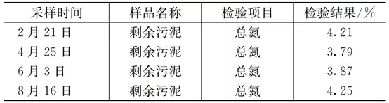 微生物在生長繁殖過程中,會(huì)攝取污水中一部分氮來合成自身細(xì)胞組分,采用《城鎮(zhèn)污水處理廠污泥檢驗(yàn)方法》(cj/t 221-2005)第49章中的方法對剩余污泥中氮含量進(jìn)行檢測,檢測時(shí)間為2020年,檢測結(jié)果見表1。