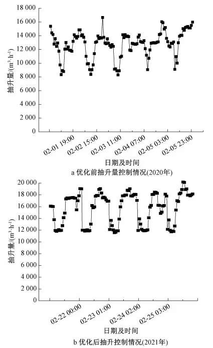再生水廠結(jié)合來水時(shí)變化及日變化規(guī)律,通過生物池及膜池間歇停運(yùn)的方式(見表4),提高日水力負(fù)荷至70%以上。并充分利用上游污水管網(wǎng)調(diào)蓄功能,控制瞬時(shí)最低抽升量不低于運(yùn)行曝氣池負(fù)荷的60%(見圖3b)。