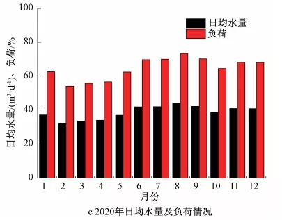 受城市生產(chǎn)活動(dòng)的影響,污水處理廠在實(shí)際運(yùn)行過程中不同時(shí)段、季節(jié)來水水量呈規(guī)律性波動(dòng)。水力負(fù)荷過低或水量時(shí)變化系數(shù)過大對回流液do濃度、內(nèi)回流比等脫氮重點(diǎn)指標(biāo)控制會(huì)帶來一定困難。以再生水廠2020年來水情況為例,水量峰谷差值比例超過50%(見圖3a),瞬時(shí)最低負(fù)荷僅為設(shè)計(jì)值的30%。不同月份水量差異也較為明顯,最低負(fù)荷僅為設(shè)計(jì)值的53%(見圖3c)。