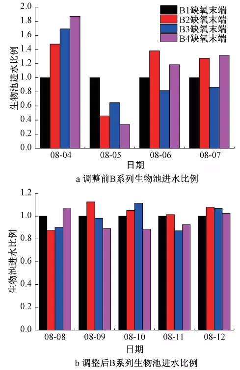如圖5所示,開展配水優(yōu)化工作后,各生物池間進(jìn)水均勻度明顯提升,同一系列各生物池間進(jìn)水比例差值由33%降低至15%左右。