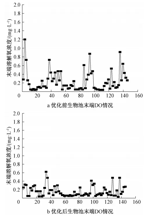 通過配水優(yōu)化、抽升控制、生物池倒運(yùn)等方式,穩(wěn)定生物池水力負(fù)荷。優(yōu)化后,生物池do穩(wěn)定性明顯提高(見圖6b),末端do濃度基本低于0.5 mg/l,滿足反硝化對于do濃度的要求,同時(shí)大大降低了回流液中的do對于進(jìn)水碳源的浪費(fèi)。