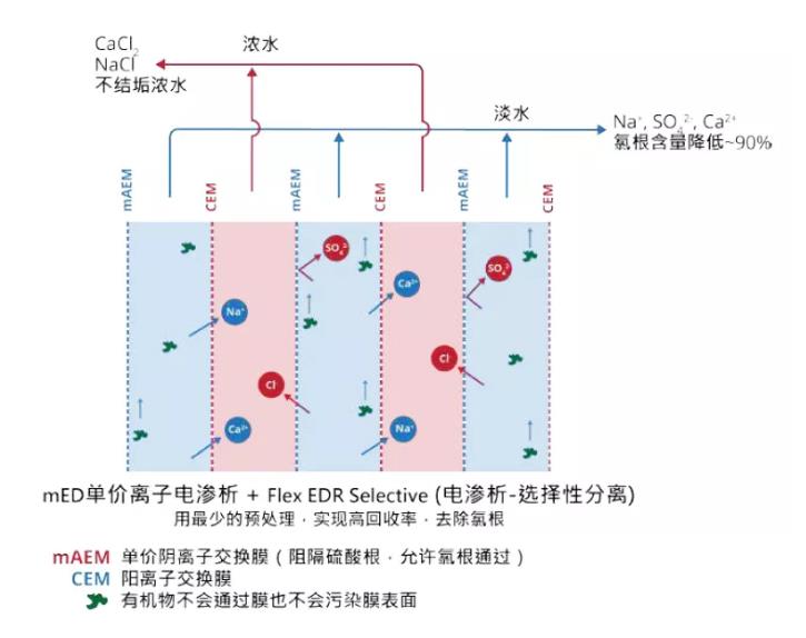 零排放中的預(yù)處理配套代價(jià)一般比較高,光一個(gè)除硬的工藝配套可能都要多級處理,而上述選擇性edr電滲析系統(tǒng)濃縮一價(jià)鹽的同時(shí)對二價(jià)鹽具有截留效率,可以有效避免濃縮過程中部分無機(jī)結(jié)垢,從而降低系統(tǒng)進(jìn)水除硬的要求。有時(shí)候廢水可以不經(jīng)過除硬直接進(jìn)入系統(tǒng),縮短工藝流程,降低系統(tǒng)投資和運(yùn)行成本等。