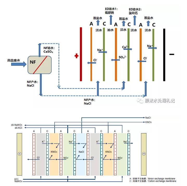 nf-ed的聯(lián)用工藝可以算一個(gè)思路,工藝可行性沒有問題,它其實(shí)是置換電滲析(第二張圖)的延伸應(yīng)用。這種工藝在廢水處理需求中落地性會受限于多種因素,如廢水組成、濃水溶液的純度、脫鹽水的處理等。