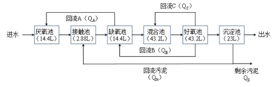小試裝置為變形uct工藝,由有機玻璃材質(zhì)制成,長×寬×高為1.44 m×0.3 m×0.3 m,有效容積為120 l,通過擋板分為5個反應(yīng)區(qū)。小試裝置反應(yīng)區(qū)構(gòu)成及其體積如圖1所示。每個反應(yīng)池設(shè)有攪拌器,在混合池及好氧池底部各均勻布置6個曝氣頭。好氧池末端連接23 l柱狀沉淀池,設(shè)計表面負荷為0.64 m3/(m2·h)。為避免藻類滋生對試驗產(chǎn)生影響,整個反應(yīng)器池體用黑色遮光布進行遮光處理。