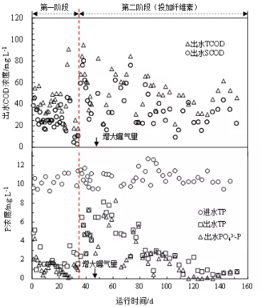 2.1 纖維素對cod與p去除的影響圖2顯示了小試裝置在整個試驗期間出水cod與磷濃度變化。在第一階段進水tcod濃度維持在450 mg/l時,出水tcod平均為(39.7±16.1)mg/l,其中scod為(24.8±10.8) mg/l,符合國家一級a排放標準。然而,當?shù)诙A段加入纖維素后,cod去除效果明顯惡化,出水tcod最高檢測值高達95 mg/l(scod為80 mg/l)。為探究加入纖維素后cod去除效果惡化原因,對出水tcod的構(gòu)成進行了分析。結(jié)果顯示,加入纖維素后出水ss顯著下降,從(48.25±3.29) mg/l降至(21.34±9.71) mg/l,由此可排除污泥沉降性能惡化導致出水cod升高問題。纖維素富含官能團且呈線狀,因此其對污泥具有較好網(wǎng)捕卷掃作用,可促進污泥絮體凝結(jié)并提高其緊密度,這一現(xiàn)象通過污泥鏡檢也得到了印證。然而,不論是因纖維素自身作為cod消耗氧氣,還是導致污泥絮體變得緊密都有可能降低氧傳質(zhì),從而弱化了對cod的降解效率。為此,在第46 天對好氧池運行進行調(diào)整,將曝氣量提高至0.30~0.50 l/min(添加纖維素前為0.10~0.20 l/min)。結(jié)果,出水cod開始逐漸下降并恢復至投加纖維素前水平(tcod=49.4 mg/l,scod=34.2 mg/l)??梢姡厥绽w維素對曝氣池運行有著積極影響,可提高氧氣傳質(zhì)與利用效率。