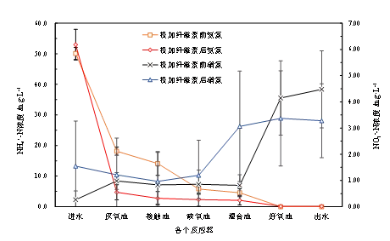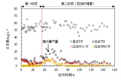 與此同時,纖維素投加對磷去除的影響與cod類似,在纖維素投加初期(第36~50 天),出水總磷(tp)和正磷酸鹽(po3-4-p)濃度均開始惡化,去除率分別降低至51.99%和56.32%。從發(fā)生原因來看,do不足是導致磷去除效率下降的主因,可以從增大曝氣量后出水tp逐漸下降得到驗證。然而,出水tp含量在提高曝氣量后的很長一段時間內(nèi)也沒有恢復至投加纖維素前水平,而是保持在(2.86±1.22) mg/l左右。為進一步分析其原因,在第68 天從曝氣池末端取混合樣進行了聚磷菌(paos)活性測定,并與投加纖維素前的活性進行了對比。結(jié)果顯示,投加纖維素后,反應(yīng)器中paos比釋磷速率和比吸磷速率分別為11.3 和12.0mg/(gvss?h),與投加前的10.8 、13.4 mg/(gvss?h)相比變化并不是很大。可見,纖維素的投加對paos活性的影響并不大。因此,反應(yīng)器除磷效果恢復較慢的原因可能與纖維素投加初期導致的跑泥和生物量恢復較慢有關(guān)。2.2 纖維素對氮去除的影響圖3顯示了在投加纖維素前后裝置對氮去除效果的變化。從整體上看,反應(yīng)器無論是否投加纖維素均能夠很好地完成脫氮,投加前出水tn、nh4+-n和 no3--n平均濃度分別(5.9±3.1)、(0.40±0.96)(4.59±2.22)mg/l,投加后為(7.80±5.46)、(1.30±2.00)、(4.11±2.22) mg/l。只是在纖維素投加初期,出水tn出現(xiàn)明顯惡化,此時出水中nh4+-n明顯增多,這顯然與上述氧傳質(zhì)受限有關(guān)。圖3顯示,在增大曝氣量后對tn的去除效率迅速恢復,主要是因為硝化能力開始恢復。