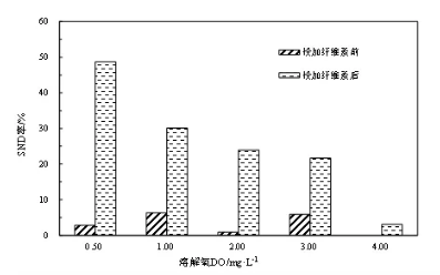 投加纖維素前后的snd效率見圖5,第一階段(未投加纖維素)無論do濃度多大,snd效率均不高(<8%);即使控制do在0.5 mg/l時,snd效率也不過2.8%。相反,第二階段添加纖維素后,snd效率明顯提高,do=0.5 mg/l時達48.69%;即使do提高至3 mg/l,snd效率依然可以保持在20%。這一結(jié)果深入揭示了纖維素對絮體致密性產(chǎn)生的絮體內(nèi)do梯度之重要作用。