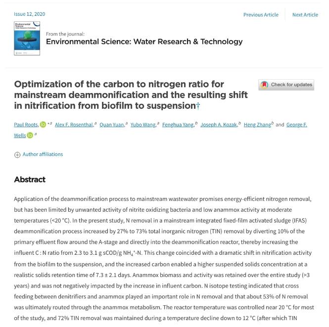 目前他們已經(jīng)有一些發(fā)表的論文成果,例如下邊這篇文章,他們發(fā)現(xiàn)改良碳氮比的過程還伴隨硝化反應(yīng)從生物膜轉(zhuǎn)移到懸浮液相中。這一個(gè)個(gè)的小發(fā)現(xiàn)都會(huì)幫助研究人員加深對(duì)pdn/a工藝關(guān)鍵控制和潛在機(jī)制的理解。