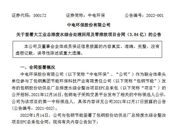 1月14日中電環(huán)保公布,公司作為聯(lián)合體牽頭單位參與了包鋼集團(tuán)節(jié)能環(huán)??萍籍a(chǎn)業(yè)有限責(zé)任公司(“包鋼節(jié)能”)發(fā)布的包鋼股份動供總廠總排廢水綜合整治項(xiàng)目epc總承包的公開招標(biāo),2021年12月16日,包鋼電子采購交易平臺發(fā)布了相關(guān)的中標(biāo)候選人公示,公司為該項(xiàng)目的第一中標(biāo)候選人。