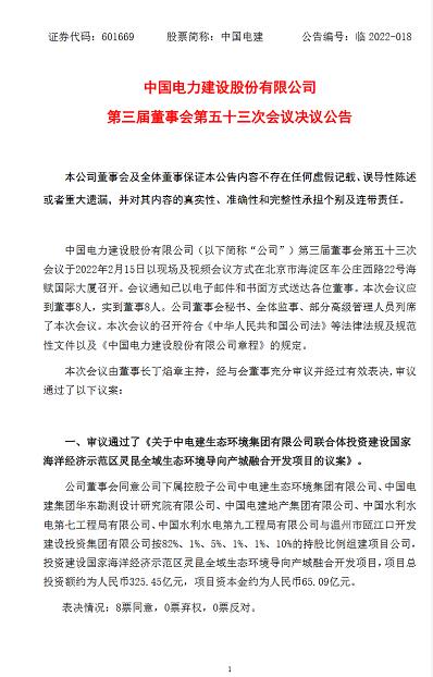近日,中國電建發(fā)布公告稱,公司審議通過了《關(guān)于中電建生態(tài)環(huán)境集團(tuán)有限公司聯(lián)合體投資建設(shè)國家海洋經(jīng)濟(jì)示范區(qū)靈昆全域生態(tài)環(huán)境導(dǎo)向產(chǎn)城融合開發(fā)項(xiàng)目的議案》。